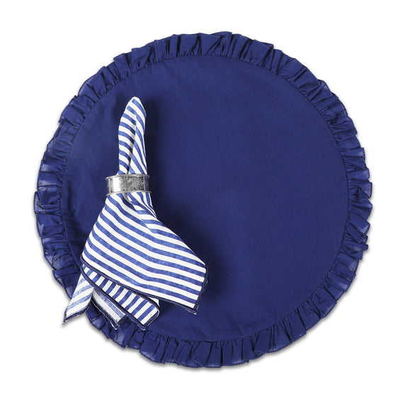 The circular placemats, crafted from 100% premium cotton, feature a delicate ruffled edge, adding a touch of soft elegance to your tablescape. Paired with hand-block printed napkins, finished with intricate embroidered corners, this set is a celebration of traditional artistry reimagined for modern dining.
