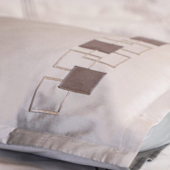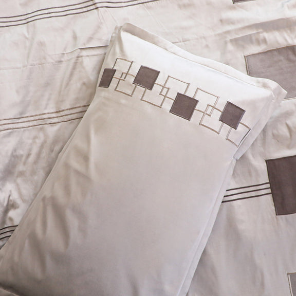 The duvet cover and cushion covers are adorned with geometric suede patchwork and fine silk embroidery, offering a refined texture that adds depth and visual appeal to your space. The cool, breathable silk front ensures year-round comfort, while the 100% soft cotton backing delivers a cozy and gentle touch against your skin.